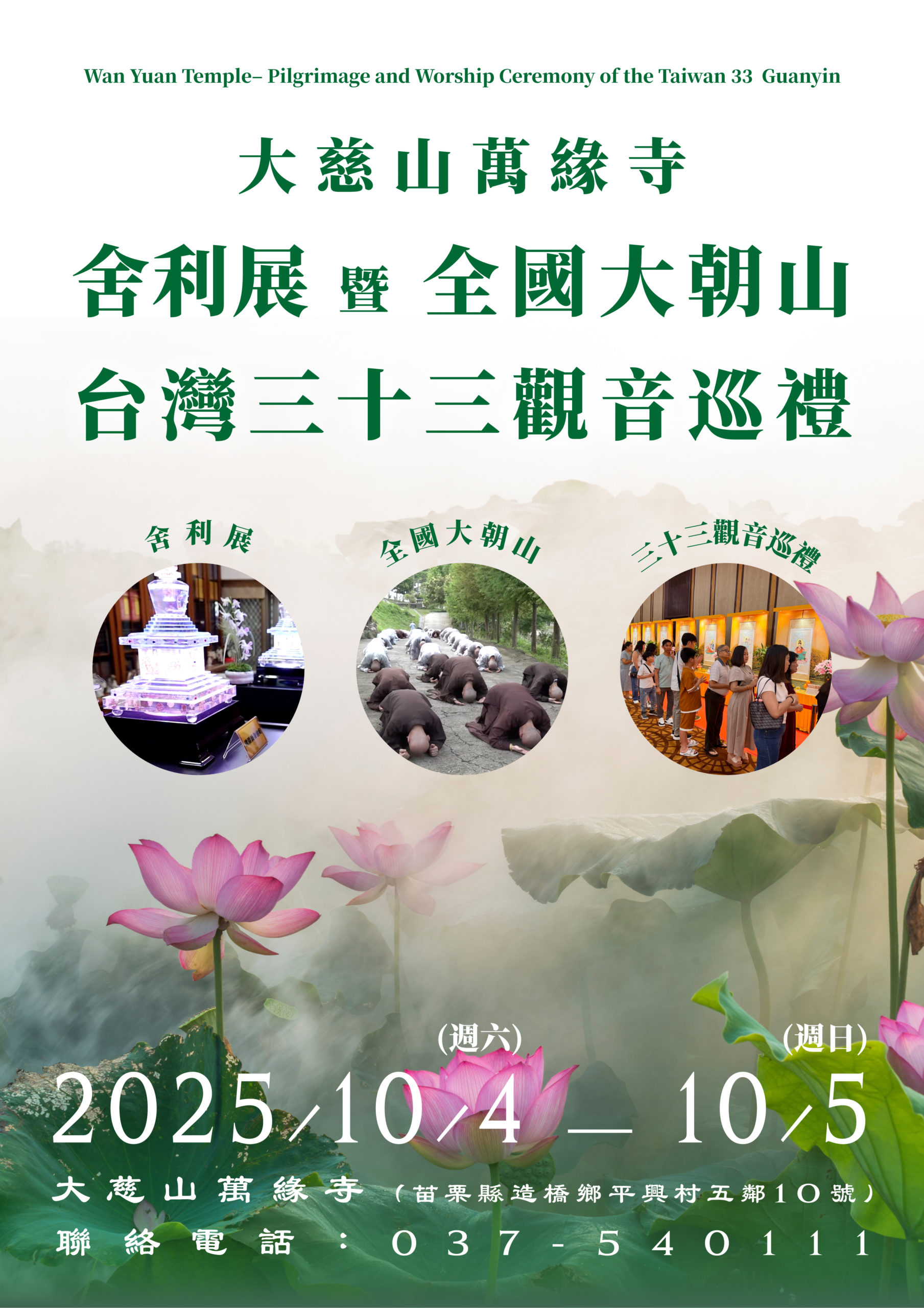 我們將於2025年10月4日(六)至10月5日(日),在 大慈山萬緣寺 隆重舉辦 「舍利展 暨 全國大朝山・台灣三十三觀音巡禮」。